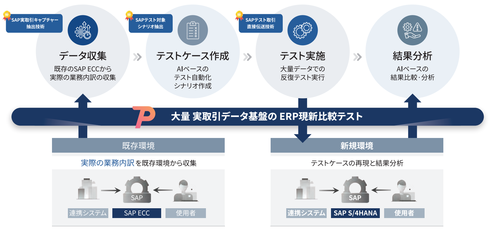 SAP ECC等既存システムの実稼働を再現し、大量の検証を、自動で、高速に、実現します。